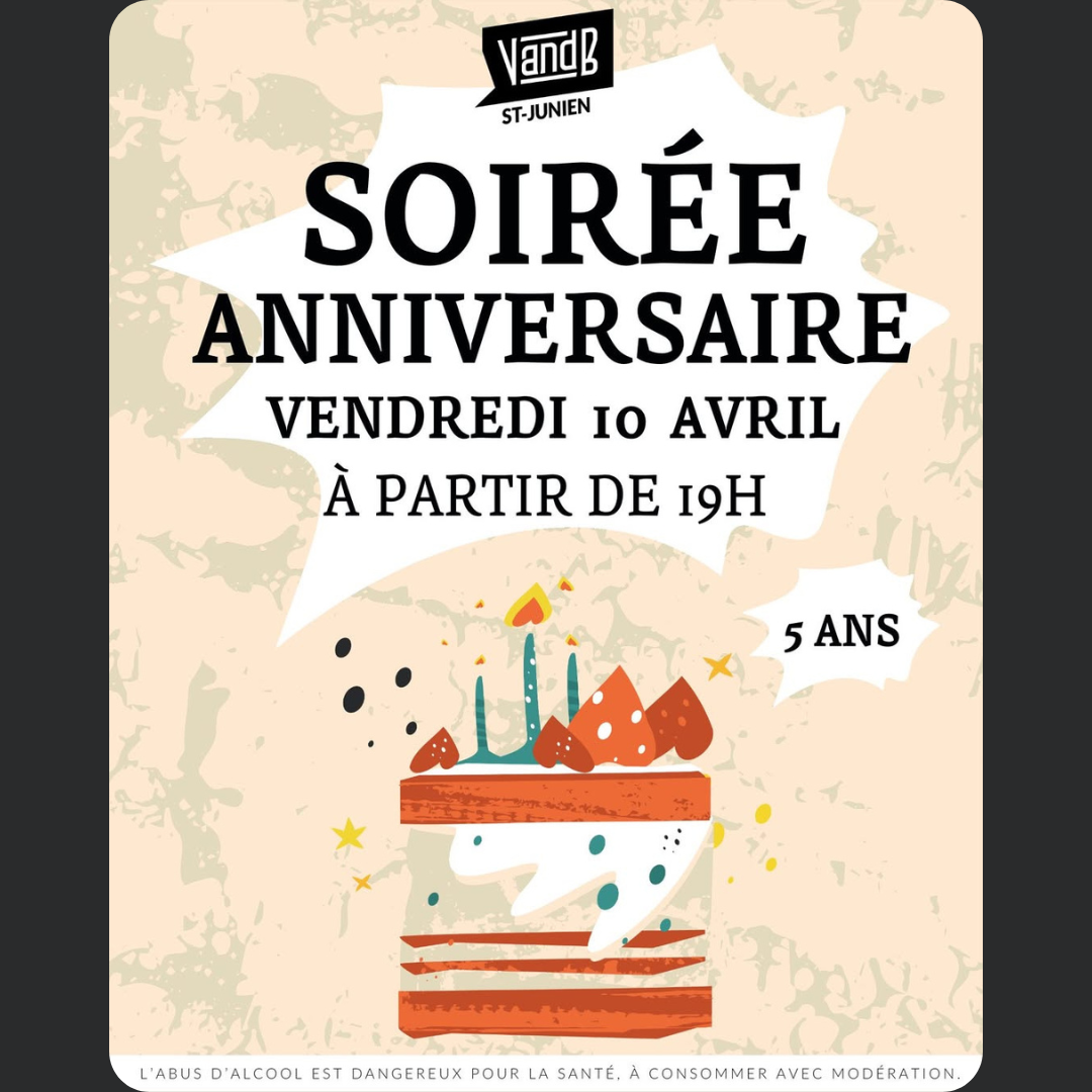 Bloquez votre soirée : le vendredi 10 avril, votre V and B Saint-Junien passe un cap symbolique. On vous attend dès 19h pour souffler ces 5 bougies ensemble. 🕯️